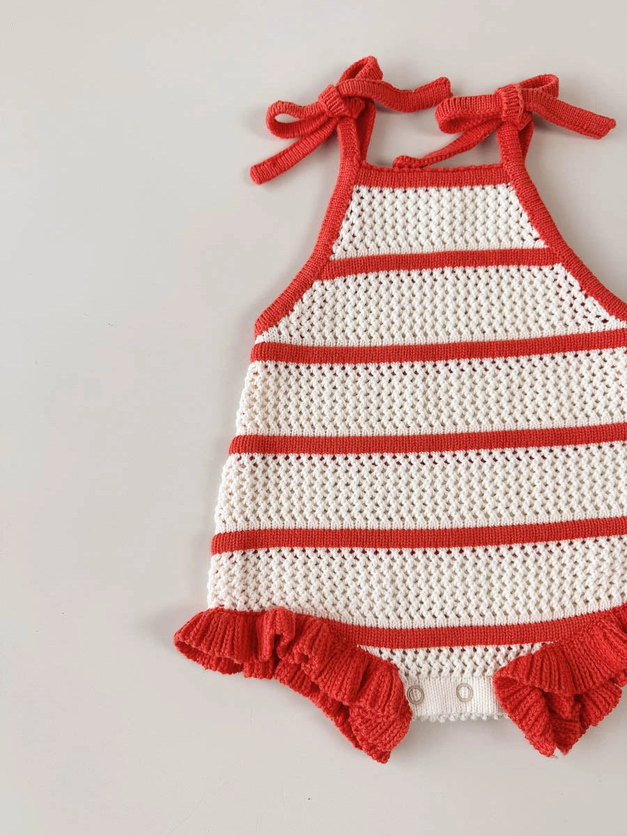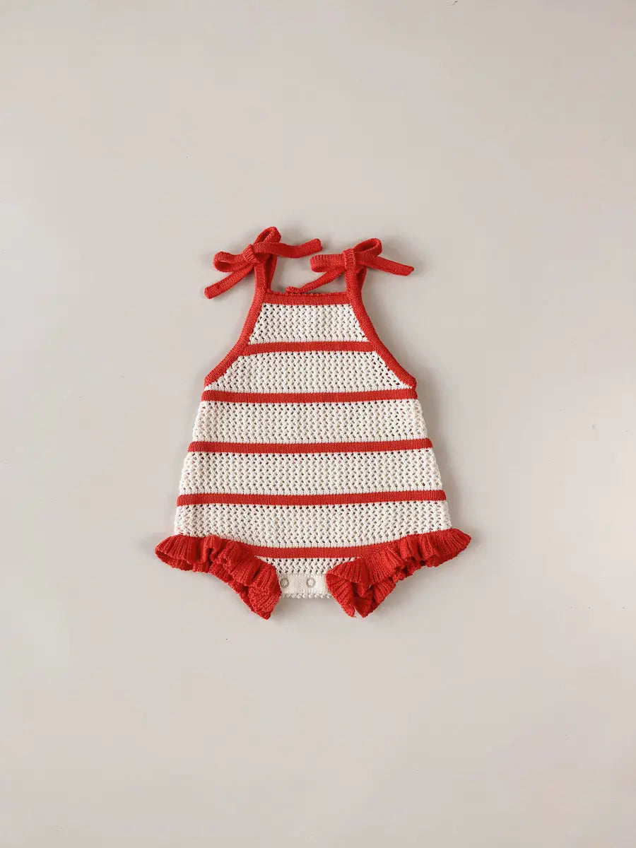 This girly crochet knit romper features breathable cotton with raised red stripes and tie shoulders for an adjustable, comfortable fit. Designed with snaps for easy nappy changes and a frill hem, it’s perfect for Christmas celebrations or photoshoots. Its charming style makes it easy to mix and match with siblings’ outfits, creating the sweetest coordinated look.