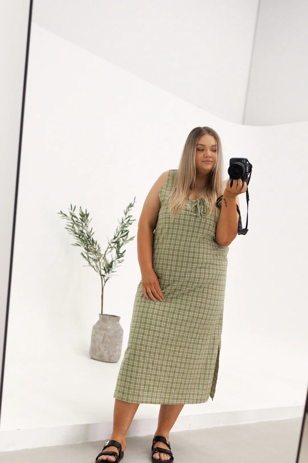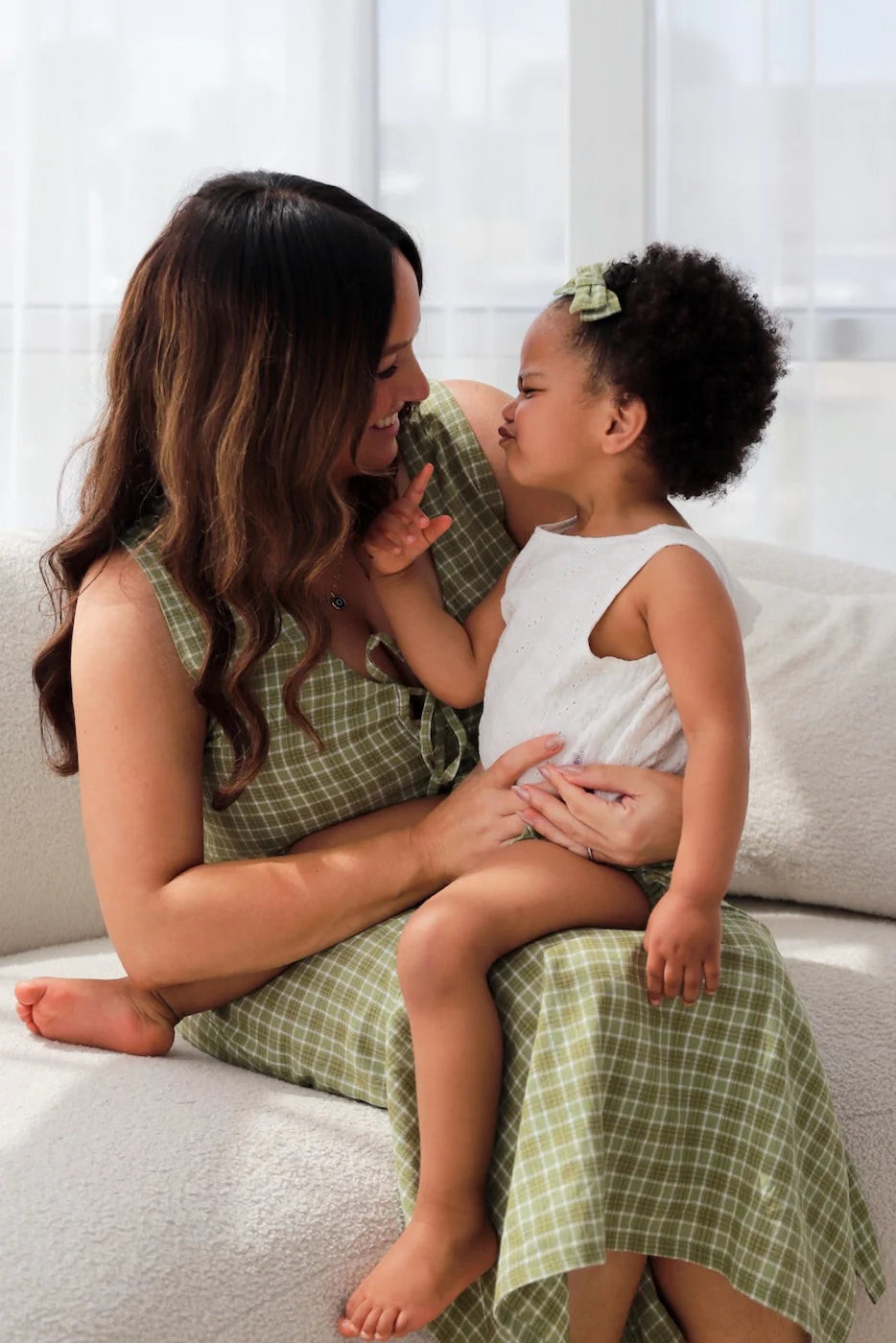 Lightweight cotton dress featuring our Thyme print. Breastfeeding friendly with invisible zips on either side. Adjustable chest tie at front and waist ties at the back allow for a flexible and customisable fit. Option to reverse dress and have tie at back or front.