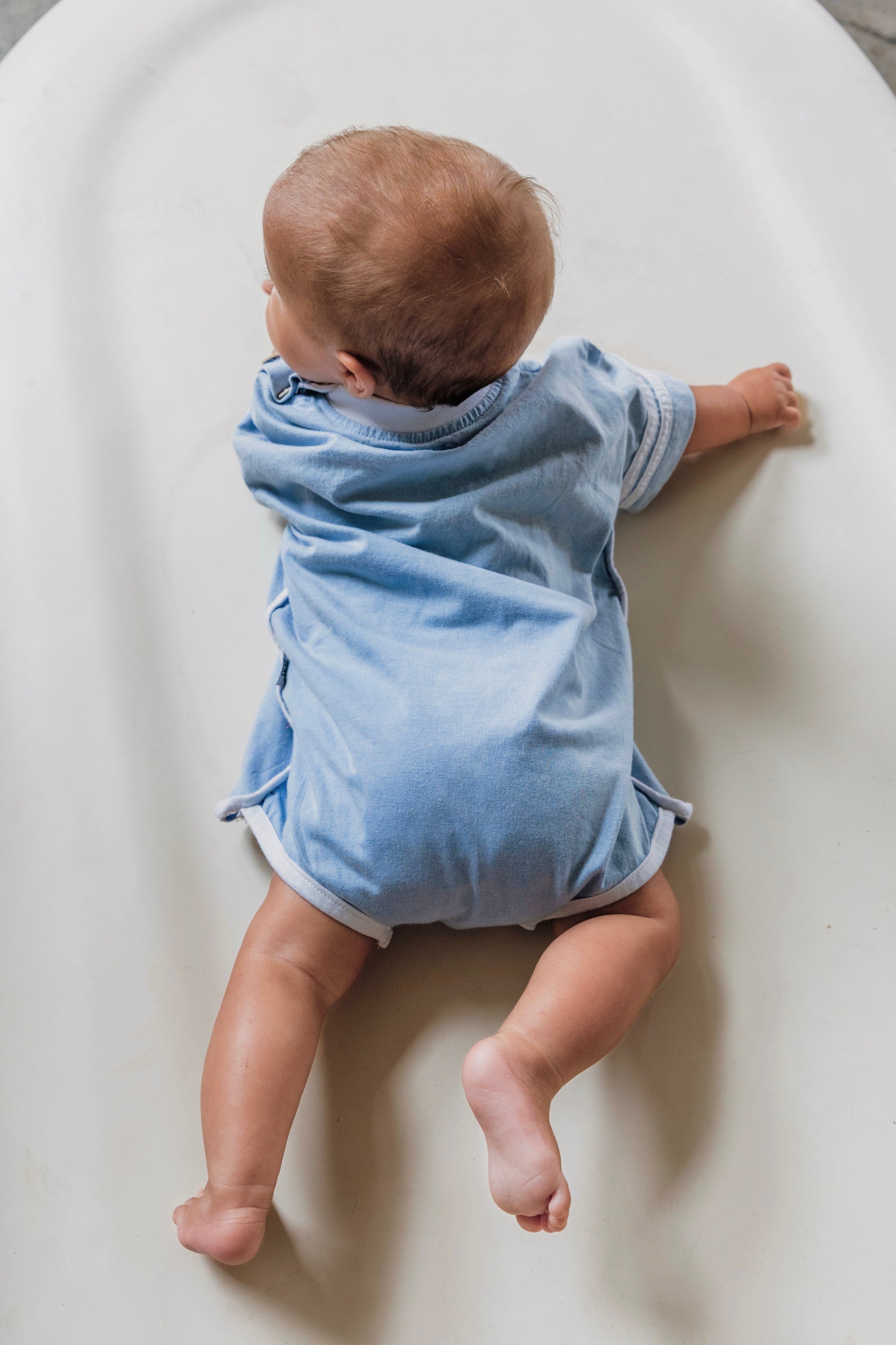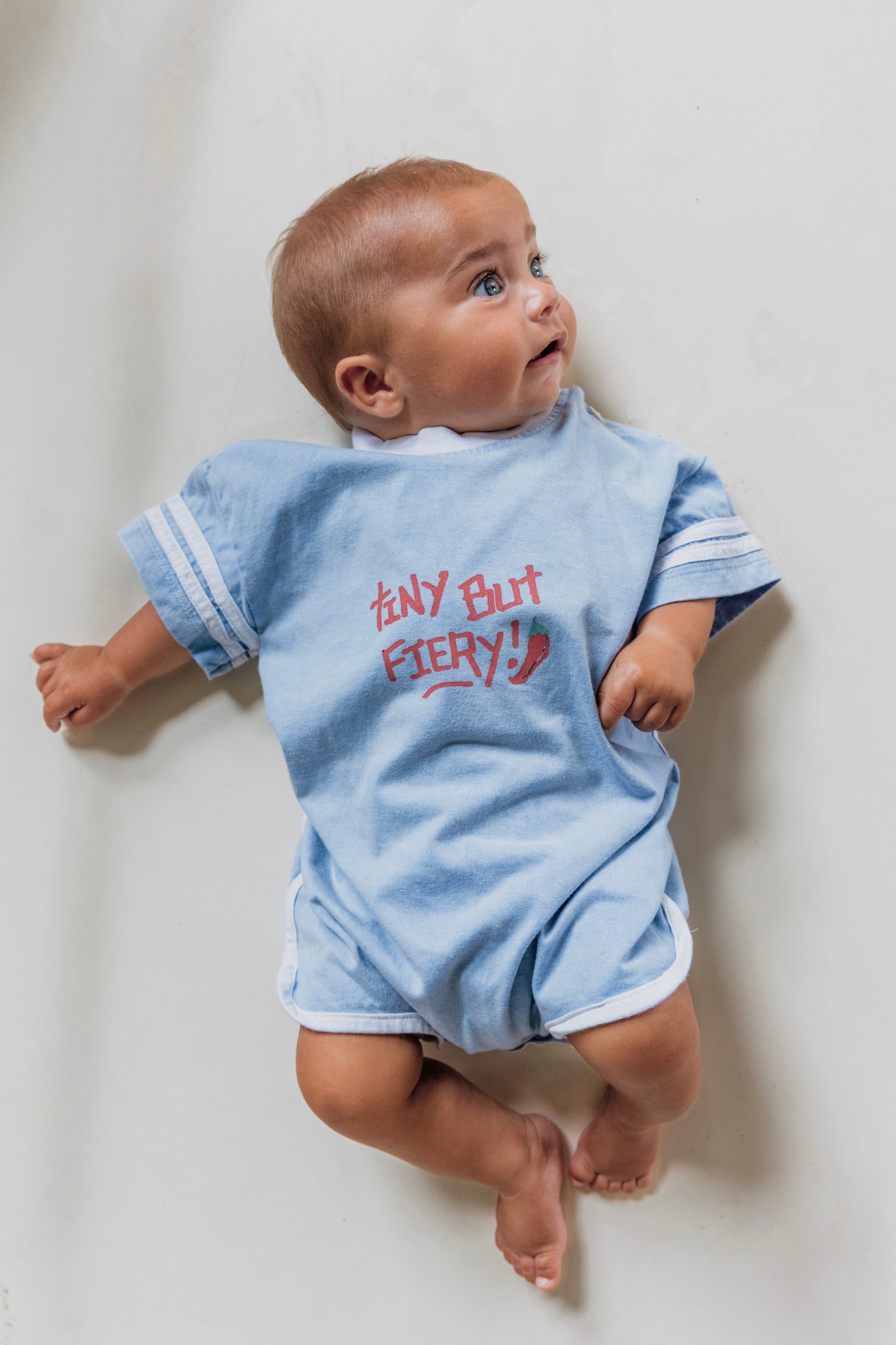Sweet, playful, and full of summer spirit. The Tiny But Fiery Romper in blue is comfy, cute, and perfect for your little one this summer season.