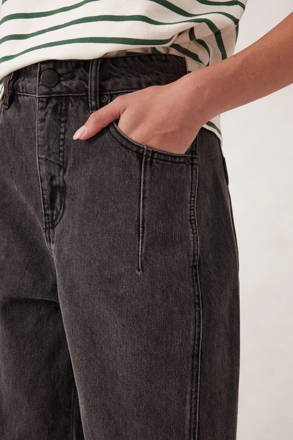 Introducing the Darted Tapered Barrel Jean, made from heavy rigid denim with 30% recycled cotton. With a mid-rise fit and a tapered barrel leg that hits just above the ankle, these jeans offer a slightly cropped, flattering silhouette. The dart detailing on the front pockets and side panel seam add a touch of subtle style. Your new go-to for effortless, everyday cool.