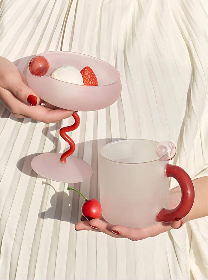 With its cute and vibrant colors and unique frosted surface, it exudes an irresistible appeal. Crafted from borosilicate glass, it withstands temperature shocks, making it perfect for drinks. Whether you're serving delectable desserts or crafting cocktails, this hand-blown masterpiece delivers elegance with every sip. Handblown with love by artisans.