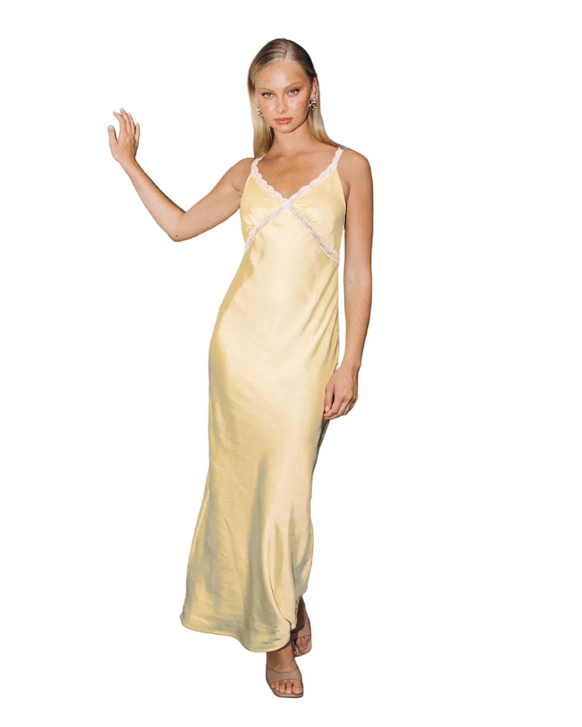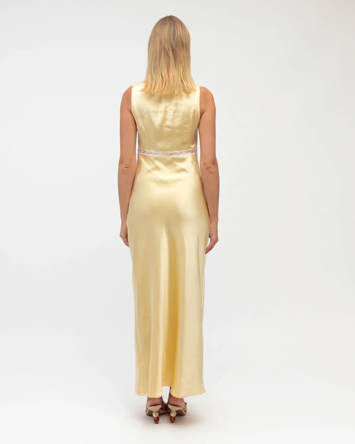 ∙ V-neckline∙ Sleeveless∙ Contrast lace trim design∙ Bust detail∙ Side zipper∙ Maxi length∙ Relaxed fit